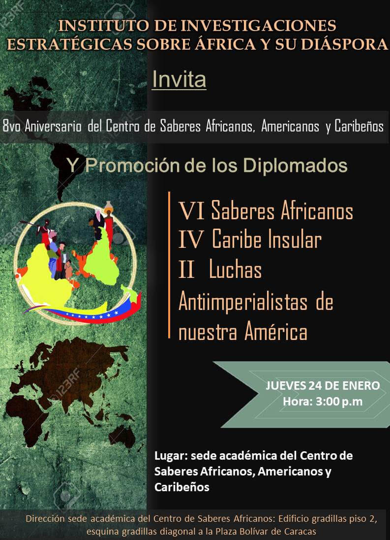 El Centro de Saberes Africanos, Americano y del Caribe esta cumpliendo quince años de existencia. Bajo la rectoría del profesor, diplomatico y primer Viceministro para Africa Doctor Reinaldo Bolivar contribuye, indiscutiblemente, a la formacion de especialistas en la geopolitica territorial anteriormente mencionada. Esta institución se suma a esfuerzos que los descendientes de la diaspora han venido realizando desde los primeros congresos panafricanos. No ha sido facil mantener este espacio sin los recursos adecuados. Hoy su directora ejecutiva profesora Reina Arratia estimula nuestra luchas tanto en la formacion de nuevas generaciones como en la comprension del continente madre: Africa..