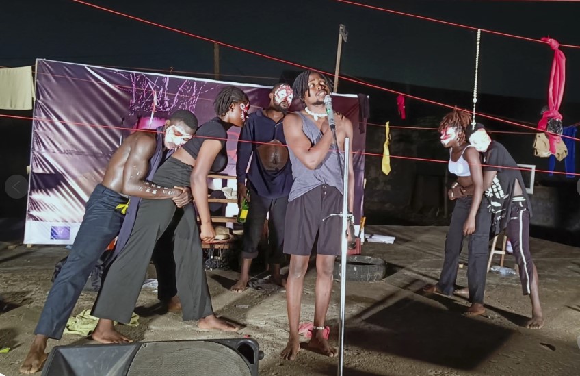 Una mujer gritó al ver lo que parecía un cadáver, una figura cubierta con una sábana y tendida en una camilla. Mientras los voluntarios la subían al escenario, Boris Taleabong Alemnge recitó un poema cuyo título expresaba lo no dicho: «Muerte».