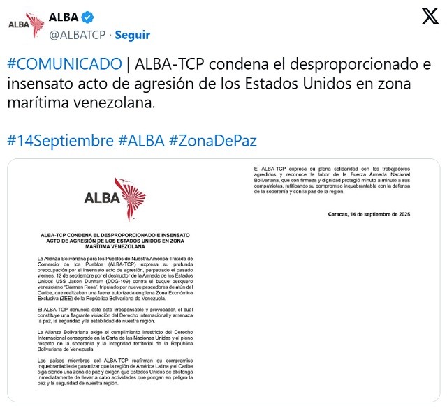 La Alianza Bolivariana para los Pueblos de Nuestra América (ALBA-TCP) expresó este domingo 14 de septiembre su “profunda preocupación por el insensato acto de agresión, perpetrado el pasado viernes por el destructor de la Armada de los Estados Unidos USS Jason Dunham (DDG-109) contra el buque pesquero venezolano ‘Carmen Rosa’“