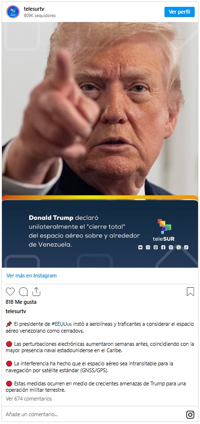 Este episodio ocurrió después de que el presidente Donald Trump declaró el cierre total del espacio aéreo venezolano y que este y sus alrededores serían objeto de vigilancia, en el marco de las crecientes amenazas de Washington contra Caracas.