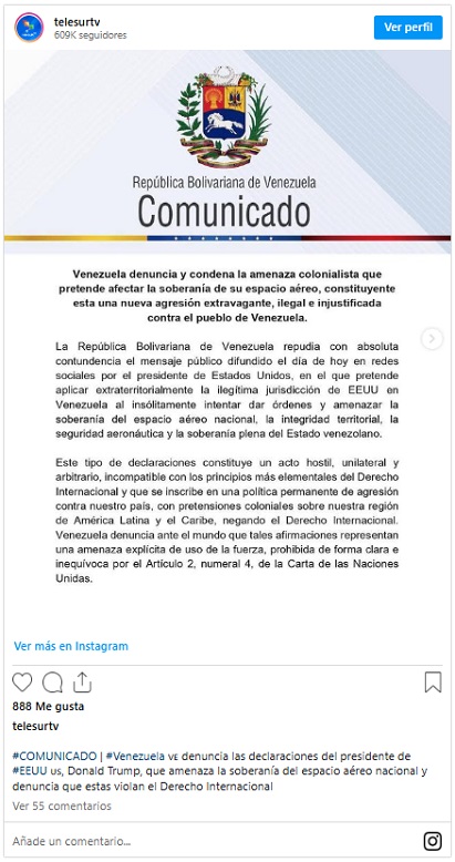 Una aeronave comercial y un avión de guerra, ambos de Estados Unidos, estuvieron a segundos de colisionar en el espacio aéreo cercano caribeño debido al despliegue militar ordenado por la Casa Blanca en esa área. Además de que la presencia de que esa flota de guerra supone una grave amenaza a Venezuela y América Latina, hay reiteradas denuncias sobre violaciones de aeronaves militares de EE.UU. a la regulación internacional para garantizar la seguridad aérea.