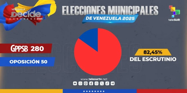 El presidente del Consejo Nacional Electoral (CNE) de Venezuela, Elvis Amoroso, anunció este domingo que el Gran Polo Patriótico Simón Bolívar (GPPSB) ganó 280 alcaldías en las Elecciones Municipales, al ofrecer una panorámica de los resultados, luego de que fueran escrutadas el 82,45 por ciento de las mesas electorales.