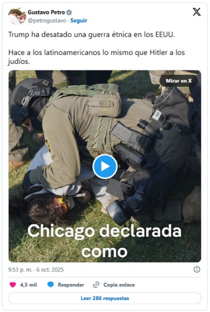 El presidente de Colombia, Gustavo Petro, acusó el lunes al mandatario estadounidense, Donald Trump, de desatar una guerra étnica contra migrantes latinoamericanos tras el despliegue de soldados de la Guardia Nacional en la ciudad de Chicago, enviados para reprimir las protestas contra las redadas migratorias.