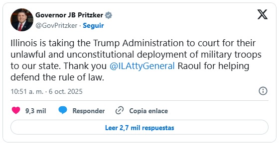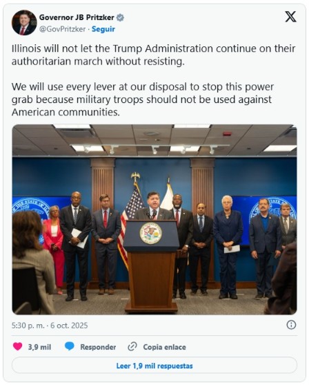 El gobernador local, J.B. Pritzker comentó en la red social X que «Illinois no permitirá que la administración Trump continúe su marcha autoritaria sin oponer resistencia» agregando que usarían todo lo necesario para detenerlo.