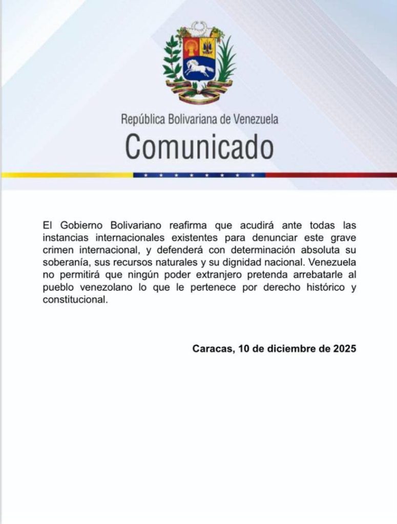 El Gobierno de la República Bolivariana de Venezuela informó que acudirá ante todas las instancias internacionales existentes para denunciar el grave crimen internacional confesado por Donald Trump, de asaltar un en el mar Caribe, y anunció que defenderá con determinación absoluta su soberanía, sus recursos naturales y su dignidad nacional.